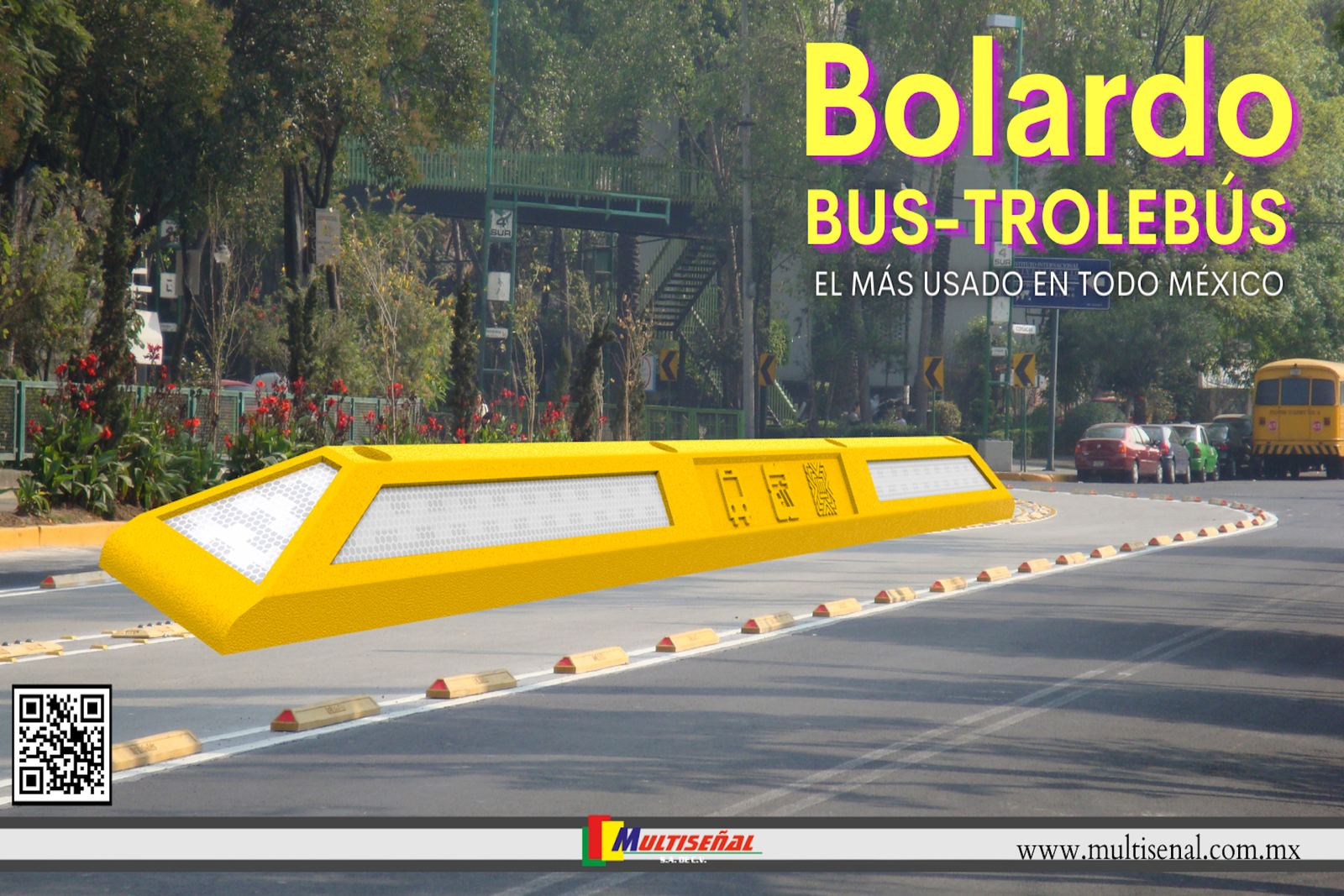 Moderno canalizador diseñado para confinar carriles de metrobús o trolebús con espacio para colocar logotipo en bajo relieve (opcional). 2 grandes áreas de reflejante en un costado y reflejantes en los extremos para aumentar el nivel de protección y visibilidad. Fabricado en polietileno de media densidad con protección U.V. Material 100% reciclado.
