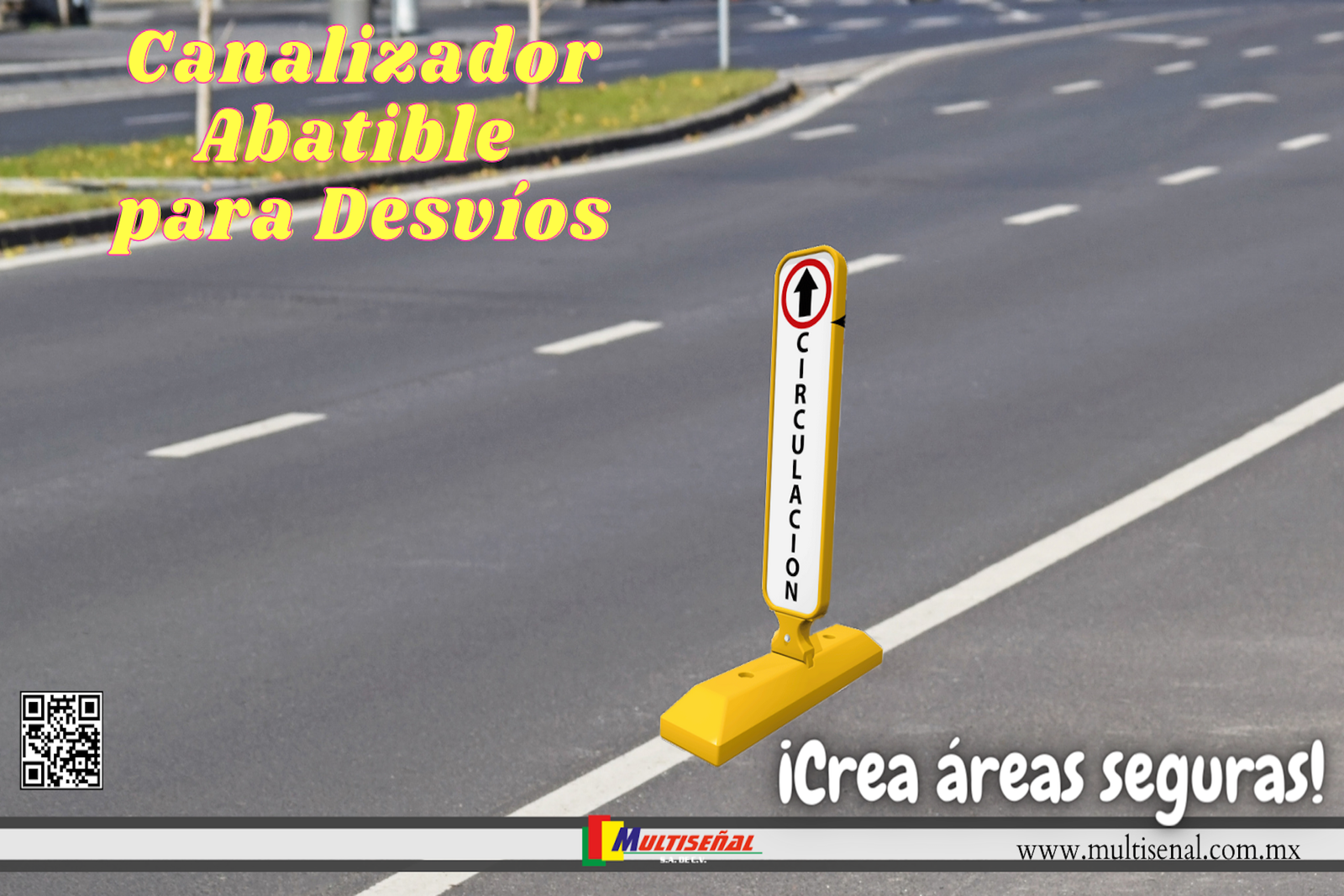 Canalizador con paleta flexible con sistema de auto recuperación por impactos. Se emplea para canalizar carriles, en zonas de acceso restringido, cuchillas o desvíos. Puede llevar todo tipo de mensajes publicitarios o de advertencia. Paleta fabricada PVC con protección U.V. No causa daño a los vehículos.